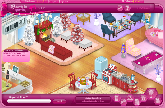 Furni Fever was since the begining of the website the only store where players could buy furniture to decorate the rooms of their Barbie Girls avatars. The store got multiple updates, some for special events and it had all sort of items. From wall decor to a fridge, the list of items was endless and many of them even had unique interactions like opening doors, turning lights on and off and little animations like a seal appearing from a pond. All items could be color changed and some had the option to add patterns. The shop also had the game Air Hockey Rally, a very popular one!