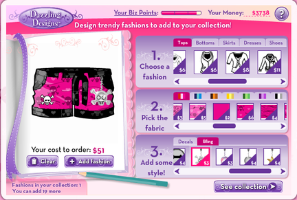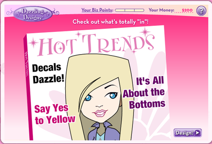 Dazzling Designs was the first new addition to the map of the World of Barbie Girls after it's large update on late 2008. It was a direct link to one of the most popular games the website would have. The game consisted on creating fashion items and selling them at a store. All designs had costs and players had to manage their budget and try to make a profit of their sales. There were tips given to players to what was trendy at the moment so they could create more sales if they followed the advice given. The player could also create discounts in orther to create last minute sales. Each level unlocked more items to use for the designs and a bigger collection could be sold at a better store.