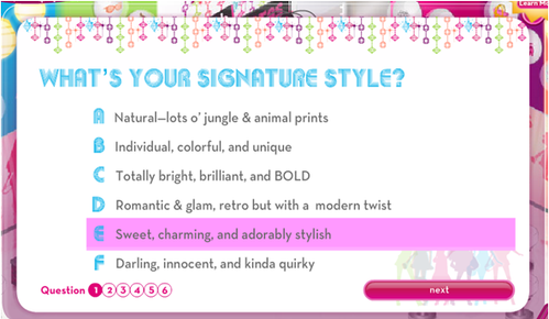 B Fab Fashionistas was added to Shop-a-Mallics during Fall 2009. The stylish new store was made to advertise the recently released Barbie Fashionistas line of dolls. The store had the six exclusive outfits from the original dolls and some other accessories shared with other stores to complete the looks. The also had the Which Fashionista are You? quiz in which all players could learn which style fitted their personality and earn a special code to receive the necklace with the style of fashionista written. The quiz could be played as many times the players wanted and all 6 necklaces could be won.